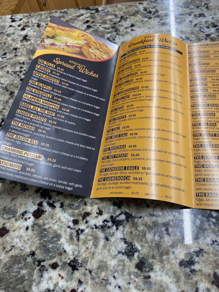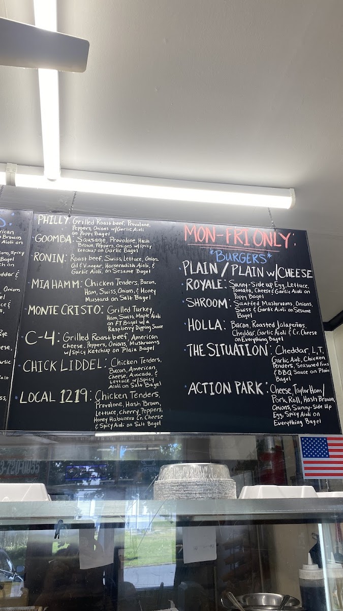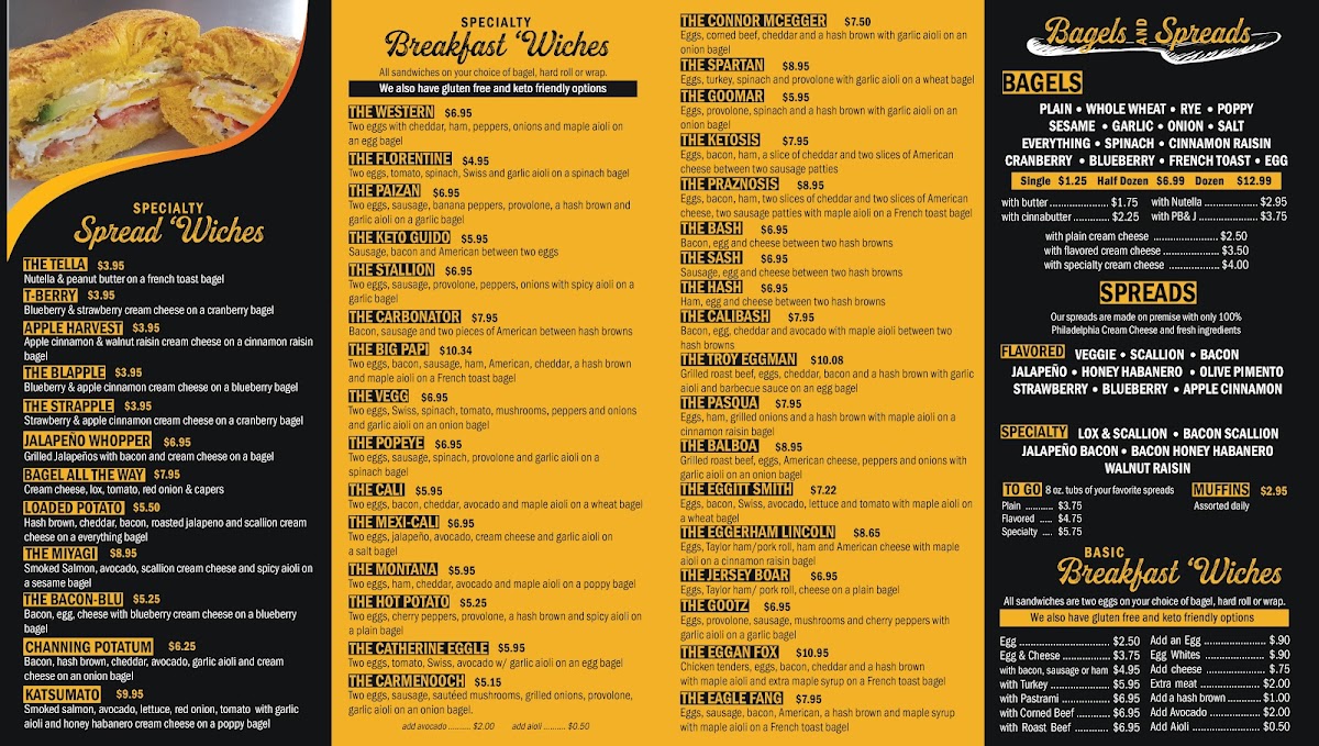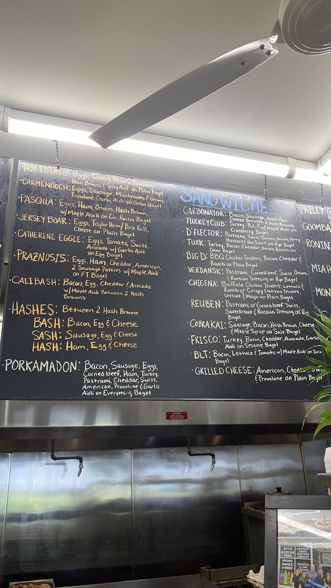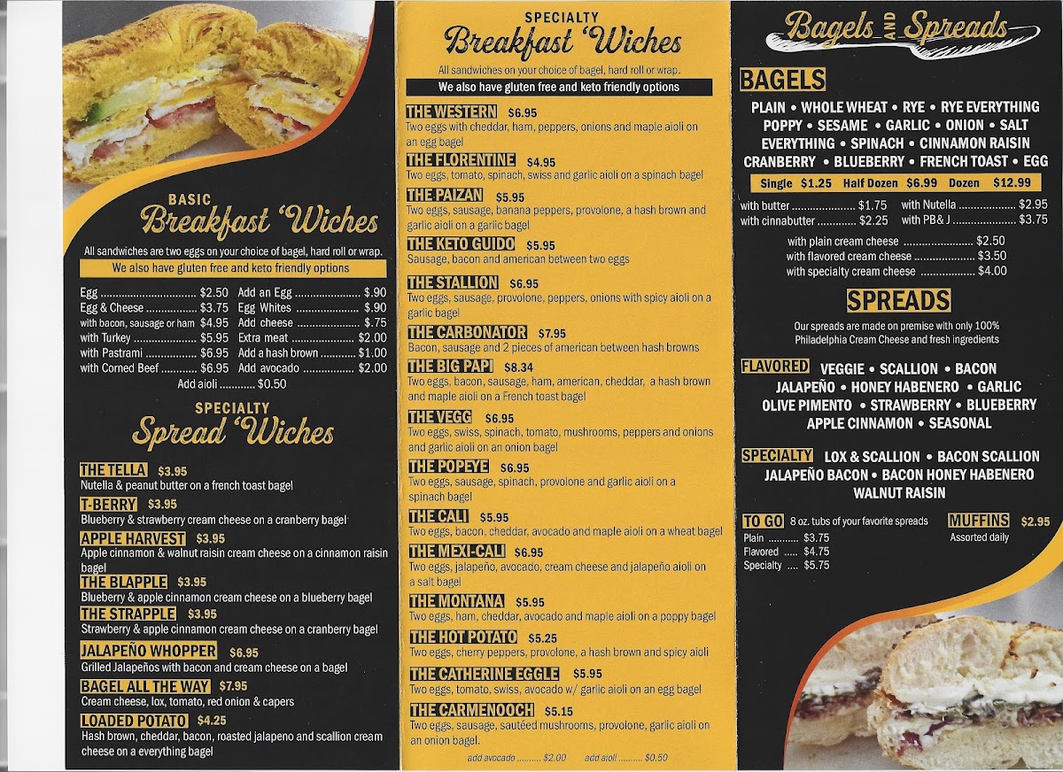 The menu features classic and creative bagel options, such as the Everything Bagel Sausage Egg and Cheese and the Smoky Smoked Salmon Bagel. You’ll find both traditional favorites like the Western Sandwich and unique combinations including the Monte Grilled with turkey and ham on a French toast bagel. There’s also a thoughtful range of extras and sides—like flavored cream cheeses and hash browns—that complement the main offerings well.